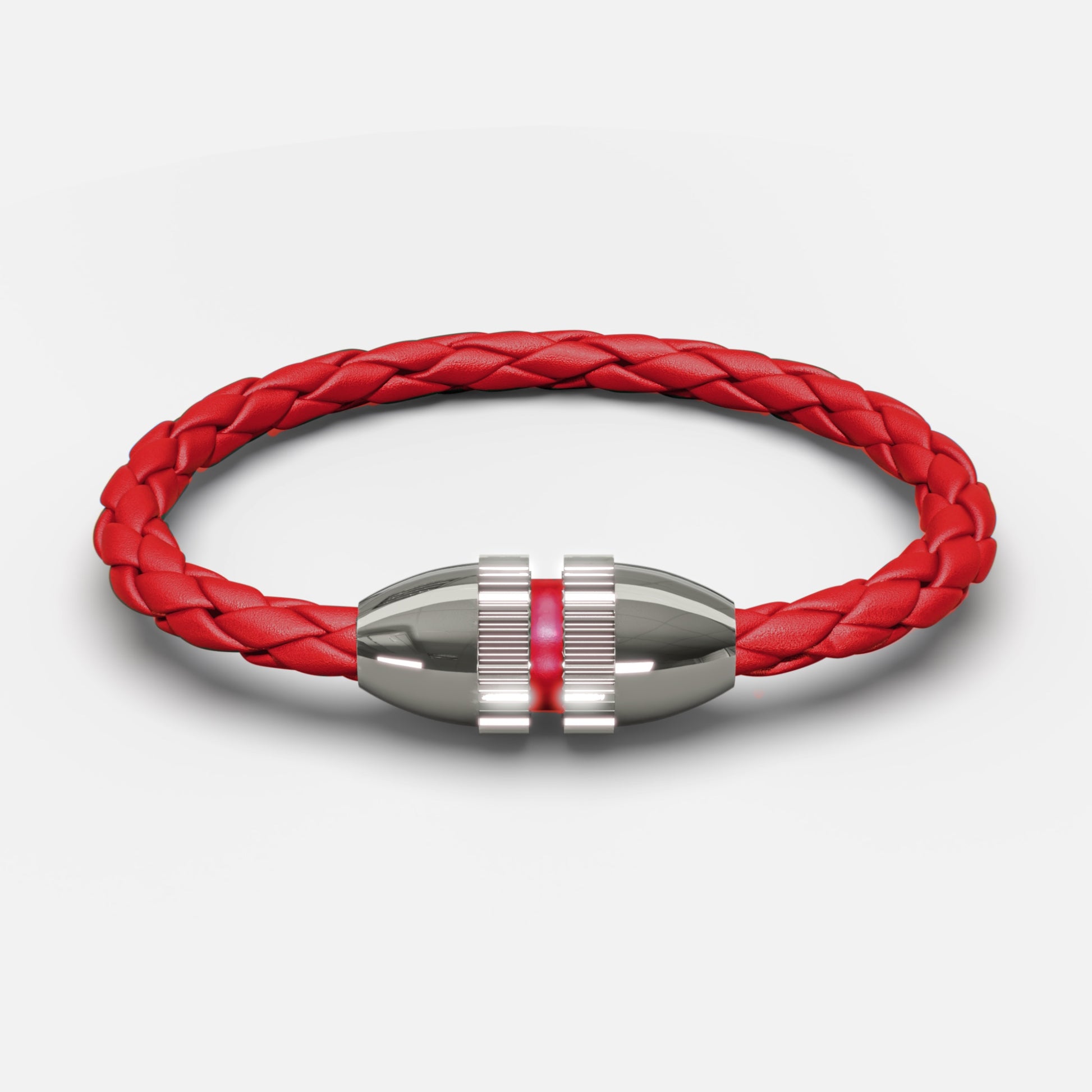A Red woven-leather bracelet with a high polish magnetic silver buckle in the center. Highlighted with a green enamel band in the middle, this leather bracelet is the perfect everyday wear accessory for you.